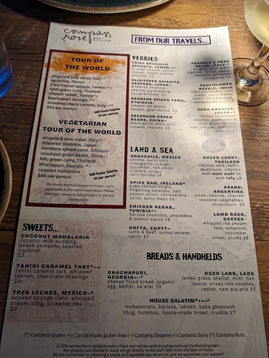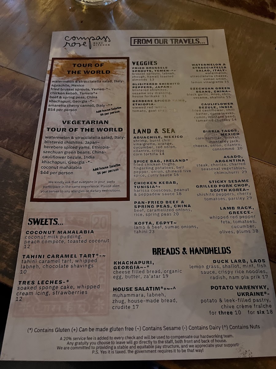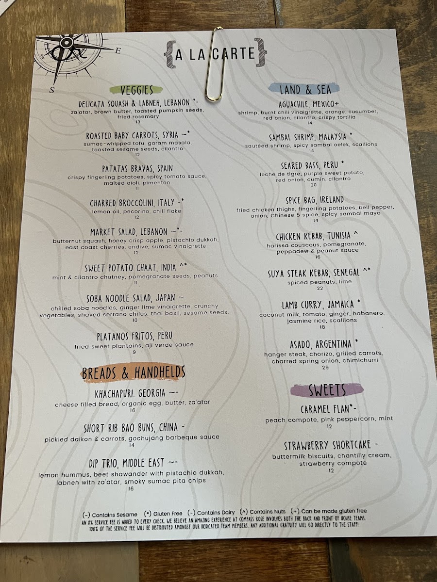 Compass Rose offers an eclectic menu that invites guests to explore a blend of global flavors within a relaxed, family-style dining setting. The dishes bring together influences from the Mediterranean, Middle Eastern, and other international cuisines, creating a menu that’s both diverse and approachable.