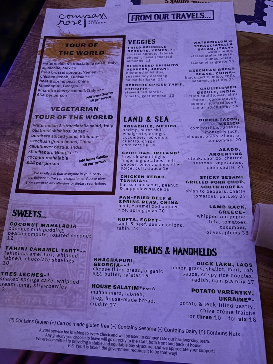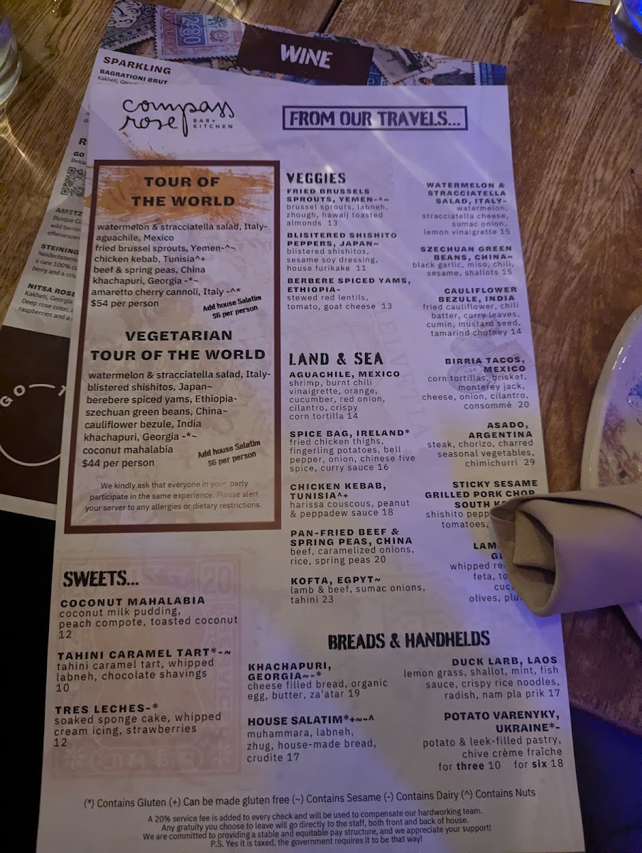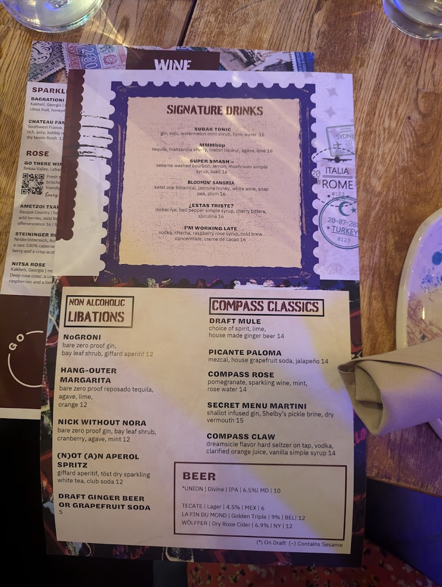 Compass Rose offers an eclectic menu that invites guests to explore a blend of global flavors within a relaxed, family-style dining setting. The dishes bring together influences from the Mediterranean, Middle Eastern, and other international cuisines, creating a menu that’s both diverse and approachable.